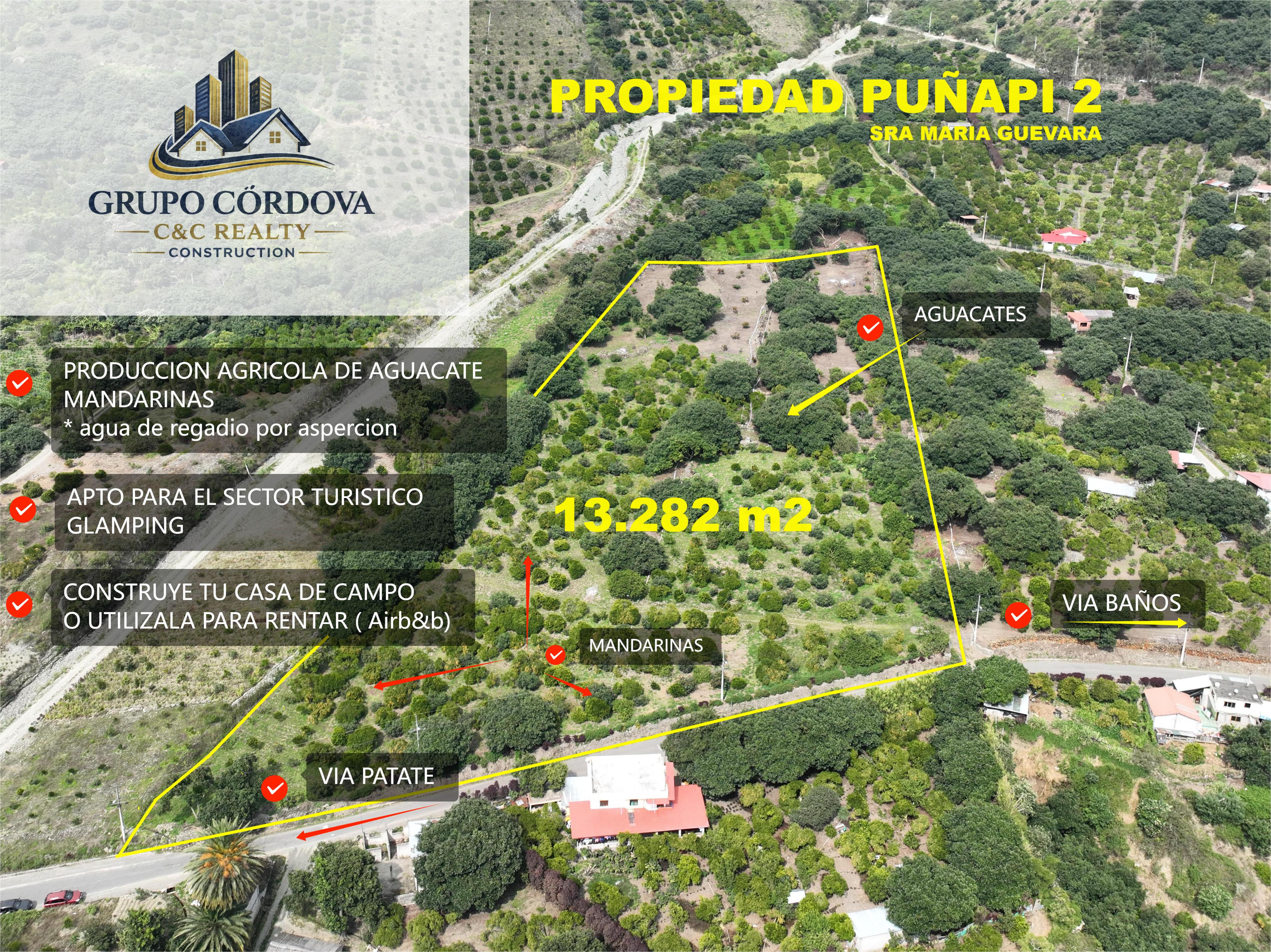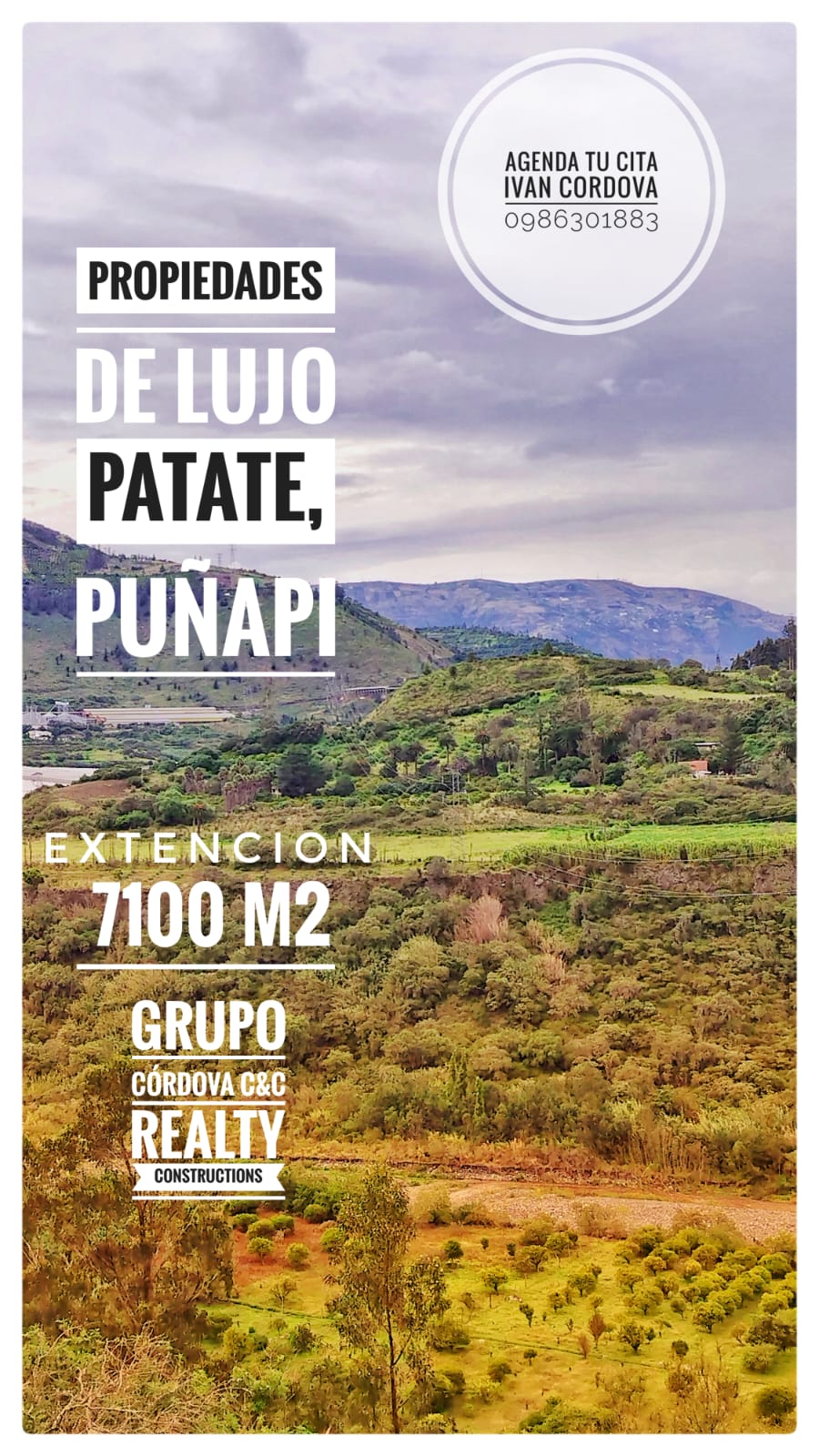 🏔️ VISTAS PRIVILEGIADAS Y ALTO POTENCIAL: Terreno Sector El Mirador, Puñapi Grupo Córdova C&C - Gestión de Activos e Inversiones Presentamos una joya inmobiliaria en el sector de El Mirador, Puñapi (Patate). Con una extensión de 7,000 m², este terreno destaca por su topografía excepcionalmente plana y sus vistas panorámicas inigualables. Con un valor de $31 por m², representa una oportunidad estratégica para quienes buscan exclusividad, producción y desarrollo arquitectónico en una sola inversión. 📍 UBICACIÓN Y ENTORNO PREFERENCIAL Sector: El Mirador, Puñapi, Patate, Tungurahua. Vistas: Escenario natural único con visibilidad completa del valle, ideal para captar el interés de proyectos turísticos de alto nivel. Exclusividad: Ubicado en una zona de baja densidad y alta demanda, perfecta para el descanso o la explotación agrícola técnica. 🏗️ APTITUD CONSTRUCTIVA Y SERVICIOS A diferencia de otros predios, este terreno cuenta con características ideales para la edificación inmediata: Topografía Plana: Facilita el diseño arquitectónico y reduce significativamente los costos de movimiento de tierras y cimentación. Potencial CUS y COS: Cumple con la normativa local para construcción, permitiendo edificar la casa de sus sueños o infraestructura turística eficiente. Servicios Garantizados: Acceso a servicios básicos y sistema de agua de regadío, vital tanto para el mantenimiento de áreas verdes como para proyectos agrícolas. 🏔️ VISIÓN DE USO MÚLTIPLE El valor de $31/m² se sustenta en la versatilidad total del predio: Residencial de Ensueño: Espacio ideal para una quinta vacacional con amplios jardines y áreas sociales. Desarrollo Turístico: Perfecto para la edificación de un mirador boutique, cabañas de lujo o centros de retiro. Sector Agrícola: Tierra fértil apta para cultivos de exportación, aprovechando el microclima de la zona. 📋 ESPECIFICACIONES TÉCNICAS Superficie: 7,000 m². Precio: $31,00 USD por metro cuadrado. Estado del Suelo: Terreno plano, listo para el desarrollo. Acceso: Vías de acceso directo en sector consolidado. 🛡️ RESPALDO Y GARANTÍA GRUPO CÓRDOVA C&C En Grupo Córdova C&C, respaldamos su inversión con rigor técnico: Certificación Legal: Documentos al día, propiedad libre de gravámenes y lista para el proceso de transferencia. Asesoría Técnica: Información detallada sobre coeficientes de edificación (CUS/COS) para su proyecto. 📞 ATENCIÓN EXCLUSIVA Y CITAS Para descubrir el potencial de esta propiedad en el sector El Mirador, contacte con nuestros especialistas: Grupo Córdova C&C Teléfono/WhatsApp: 0986301883 Email: ivancordova@grupocordovacc.com Dirección: AMBATO AV BOLIVAR Y MANUELA CANIZARES “Construya su futuro sobre una base sólida. Construya con Grupo Córdova C&C.”